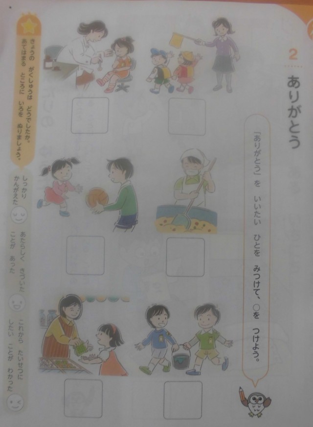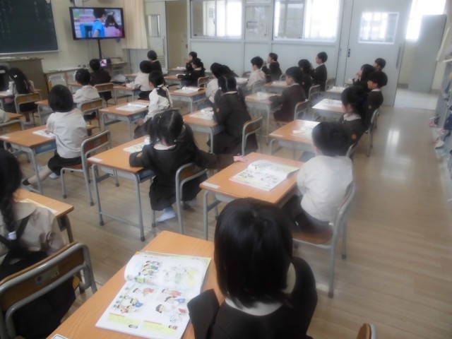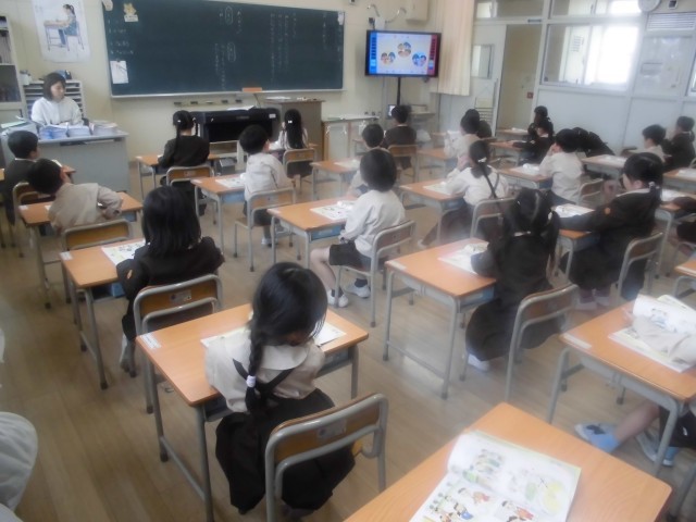 1年生は道徳科「ありがとう」を学習していました。給食調理員さんや学校医の先生などの方々からお世話になっている様子を映像で観て、「ありがとう」を伝えたとき相手の気持ちを考えていました。