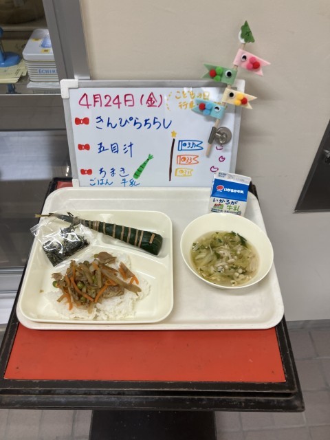 4月24日(金)の給食は、ごはん・牛乳・きんぴらちらし(きざみのり)・五目汁・ちまきです。こどもの日の行事献立になっています。