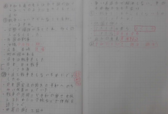 6年1組では社会科の時間、戦争について知っていることを出し合い、平和主義の考え方がどのように活かされているのか、平和な世の中にするためにできることを考えていました。