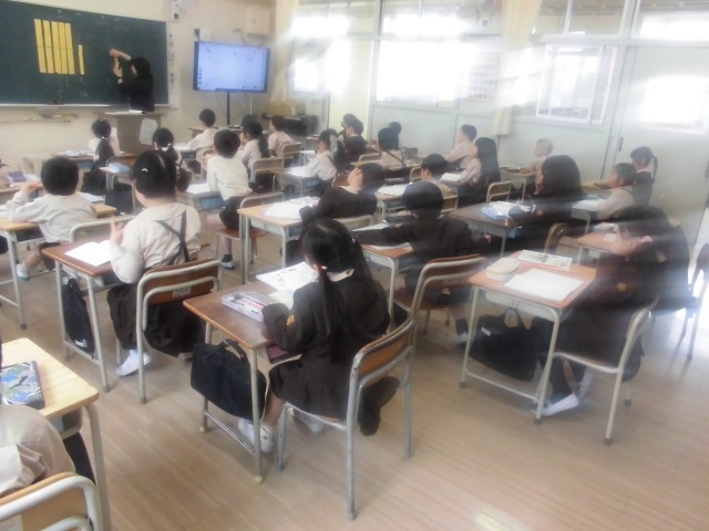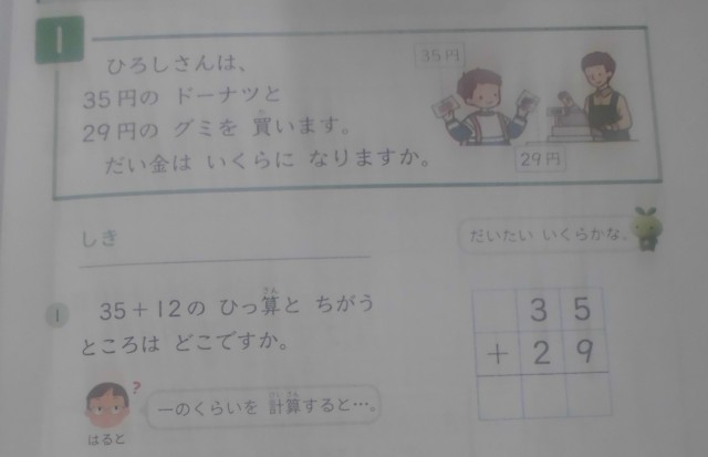 2年生は算数科「たし算のひっ算」を学習していました。「35+29」のひっ算での計算の仕方を話し合っていました。十の位を計算すると「3+2=5」、一の位を計算すると「5+9=14」になります。では、答えは「514」???