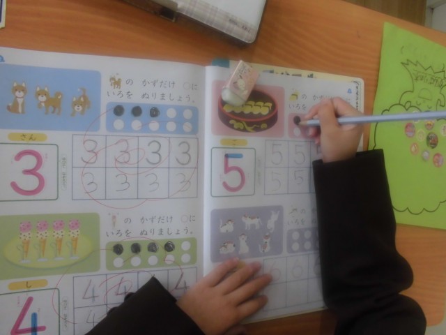 「5」の書き順や2画目横画の方向が難しかったようです。がんばって、丁寧に練習していました。