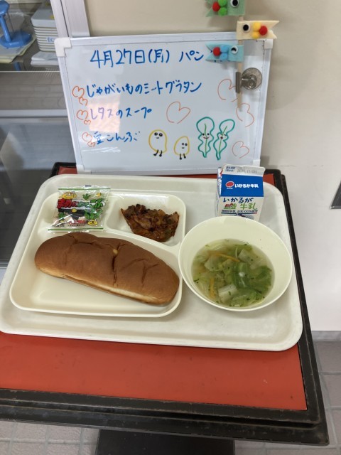 4月27日(月)の給食は、おさつパン・牛乳・ジャガイモのミートグラタン・レタスのスープ・豆昆布です。
