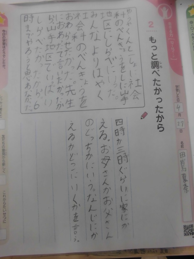 3年生は道徳科「もっと調べたかったから」を学習していました。だいきとゆうやは、社会科の課題で校区内を調べまわっていました。夢中になるうちに時刻は6時を過ぎてしまいました。急いで帰ったら家の人や先生が心配して探し回っていました。