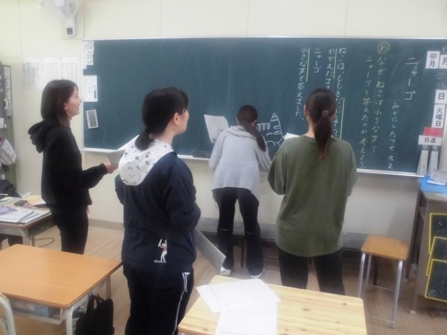 本日は、研究全大会を開いて、東京書籍2年上「ニャーゴ」の教材研究をしました。子どもたちが「人物の様子を想像して読む」ために、どんな授業にすればよいかを検討しました。