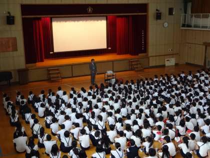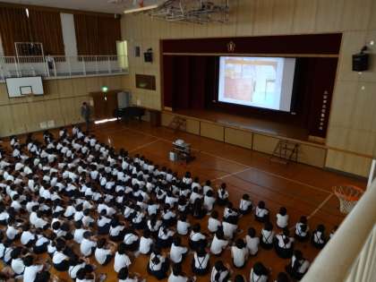 朝の児童集会では、NHK番組のDVD「シンサイミライ学校 アニメで学ぶ命を守るキズナ」を見て、大地震と津波が起こったとき、どうやって自分や家族の身を守るかについて、学習しました。