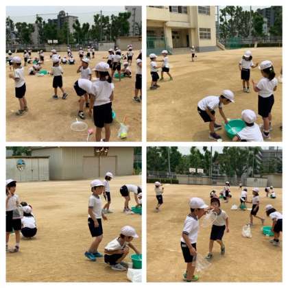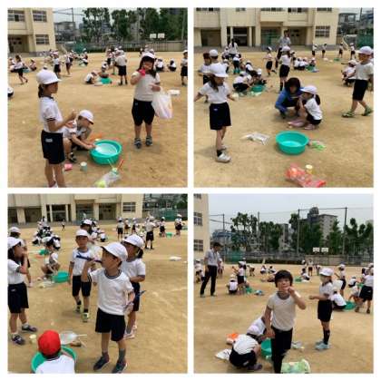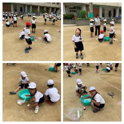 1年生がシャボン玉をつくって飛ばしています。
