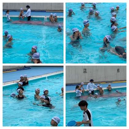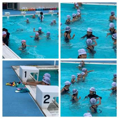 プールの底にある輪やゴム玉をもぐって取りに行っています。
