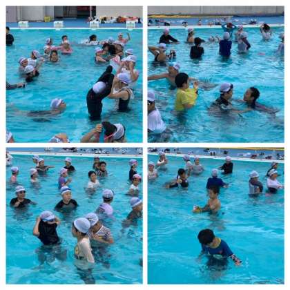 4年生が服を着たまま水中で泳いだり、浮いたりする体験をしました。