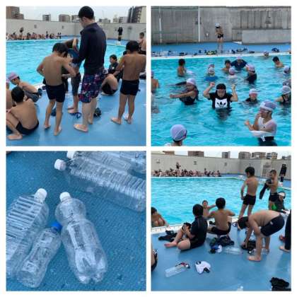 ペットボトルを浮きにして体が沈まないように保つ体験もできました。