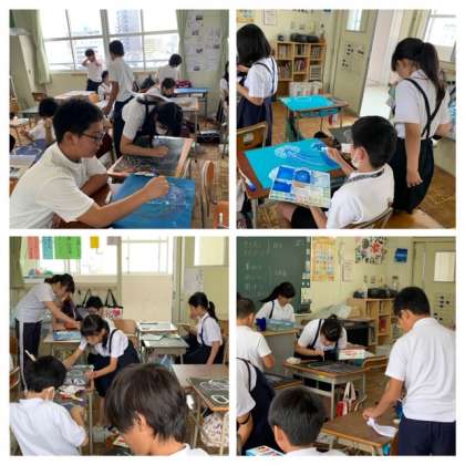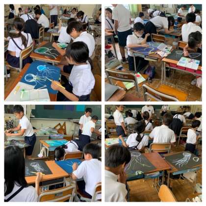 筆・竹串・割り箸・ティッシュなどを使って「クラゲ」をかいています。