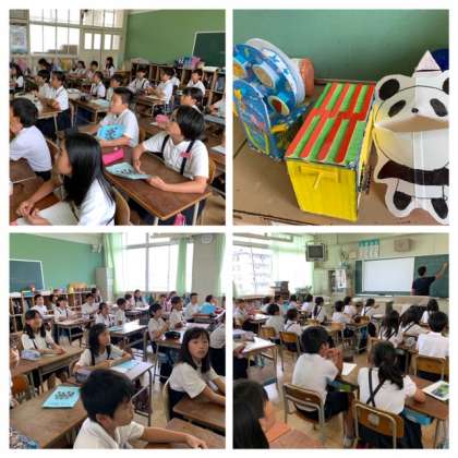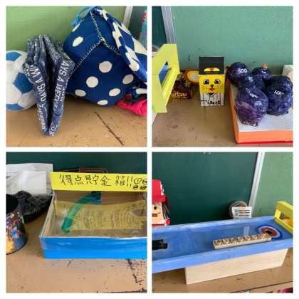 夏休みに作成したアイデア貯金箱や自由研究などが教室に飾られています。