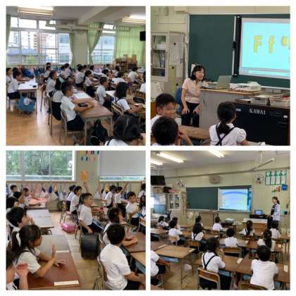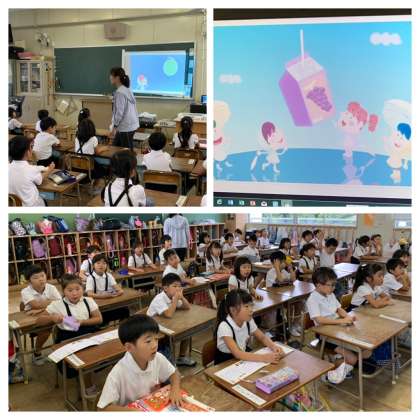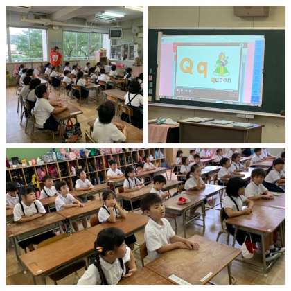 始業前の英語タイムでは、リズムや映像に合わせて元気に発音していました。