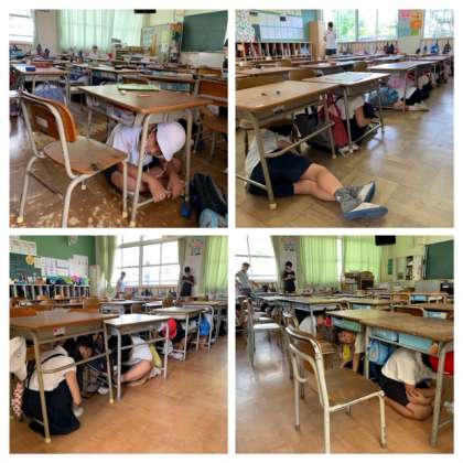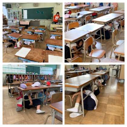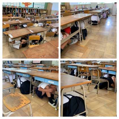 訓練の合図で机下に身をかくし、頭上の落下物から身を守ります。