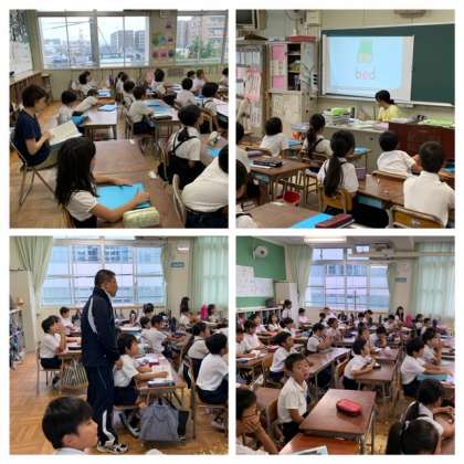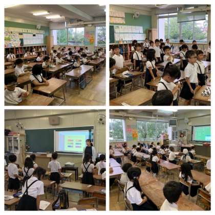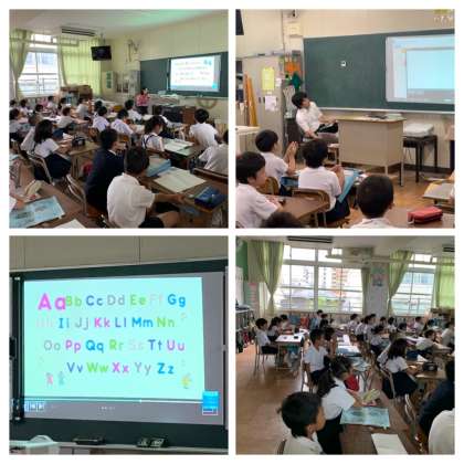 始業前の英語タイムでは、興味をもって参加する児童が多いです。