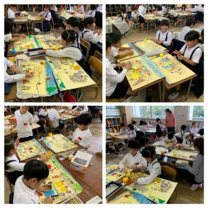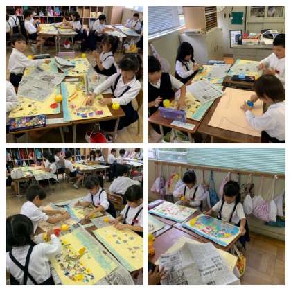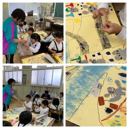 1年生の図工では、パスでかいた絵のところどころに新聞紙をちぎって置いています。