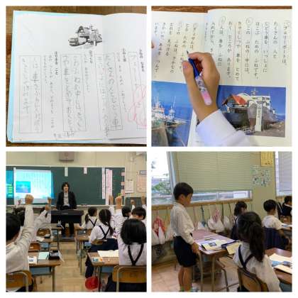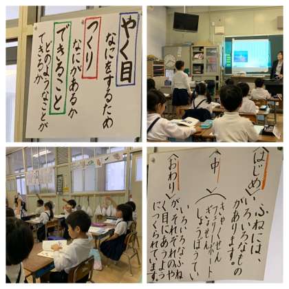 1年生の国語では、各学級で「いろいろなふね」について「やく目」「つくり」「できること」に分けて書く学習をしています。