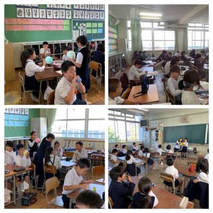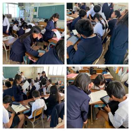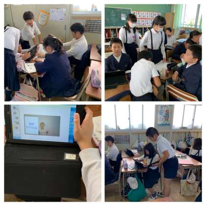 5年生はタブレットを使って、林間学習のようすなどを振り返り、プレゼンテーションを作っています。