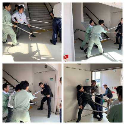 不審者がナイフを出したところで、教職員がさすまたを使って不審者を追いつめていきます。