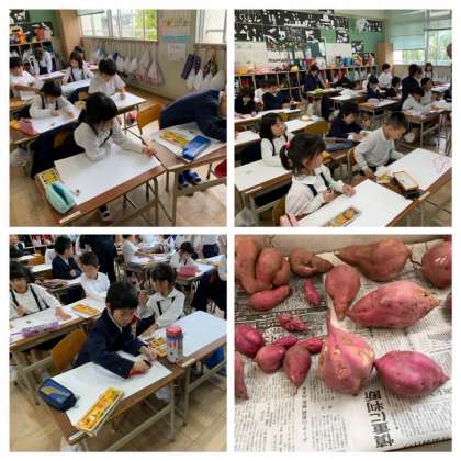 2年生は収穫したさつまいもの絵をかいています。