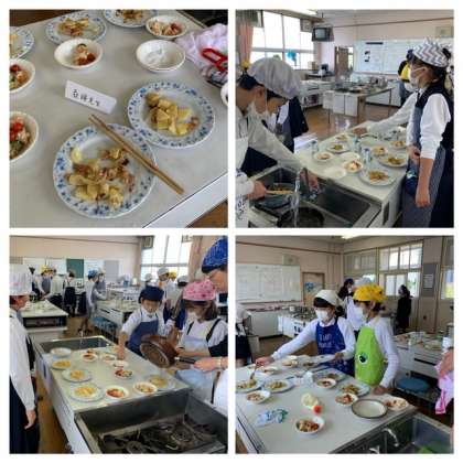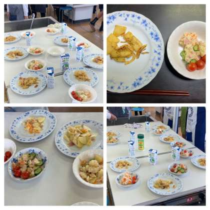 使い終わった調理器具も分担して洗い、給食と一緒に料理をいただきます。