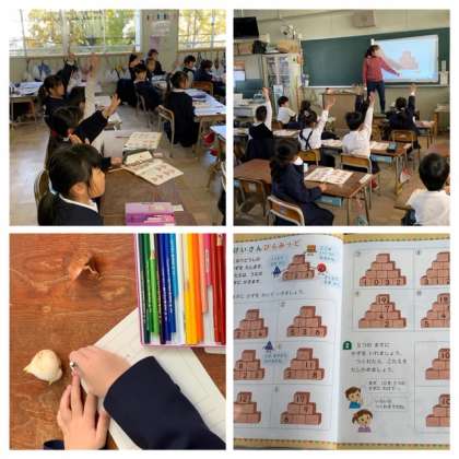 1年生のさんすうでは、計算ピラミッドに取り組んでいます。