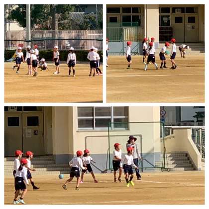 2年生は運動場でボール運動をした後、ゲームをしています。