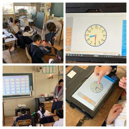 1年生がタブレット端末で時計の動きを確かめています。