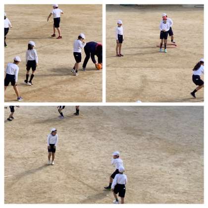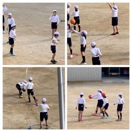 4年生がフープを使ってボール運動をしています。