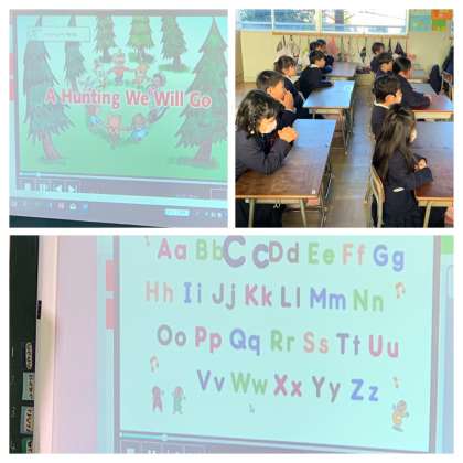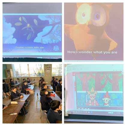 1年生は、英語タイムで歌を歌いながら英語に親しんでいます。