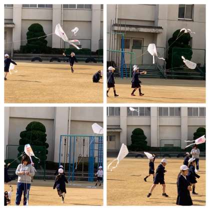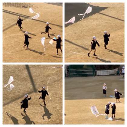 たこあげの準備をして、運動場で元気に走り回っています。