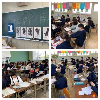 2年生が、活動している自分を紙版画にしようと頑張っています。