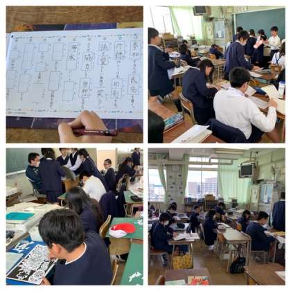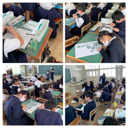 5年生は、切り絵や漢字練習に取り組んでいます。