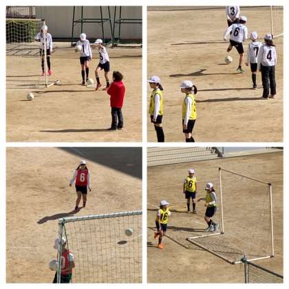 6年生は、サッカーでグループ毎にパスやシュートの練習をしています。