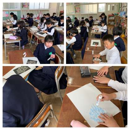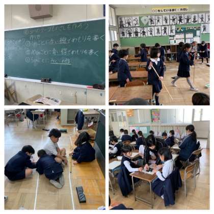 2年生が、3mの紙物差しをつくっています。これをもとに学校にある物の長さを測ります。