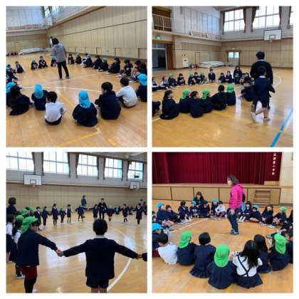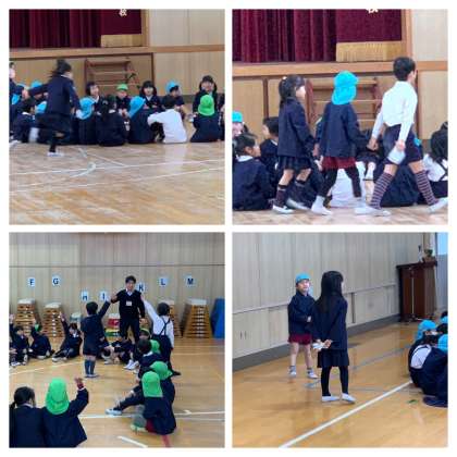 講堂で1年生とペアになって「はんかち落とし」をしました。
