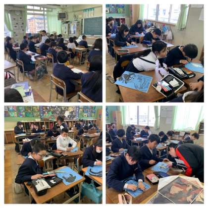 5年生は版木を彫っています。