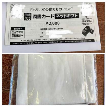 文部科学省からのマスク(1枚)と大阪府からの図書カードが配付されています。