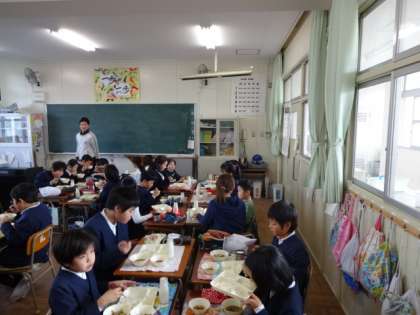 みどり保育園の園児11名が、学習と給食の体験に来校しました。