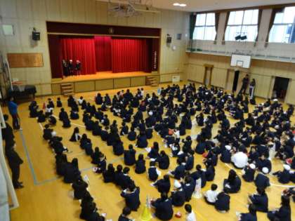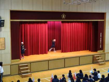 児童3人が、舞台の幕の間を、ランドセルやボール、スリッパなど学校にあるいろいろなものを持って移動し、全校児童がクイズに答えるゲームです。