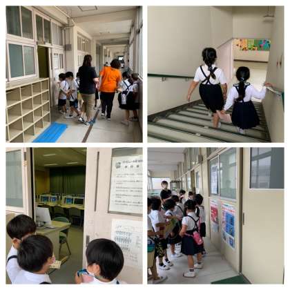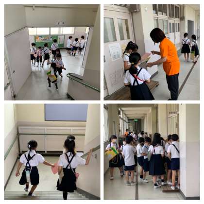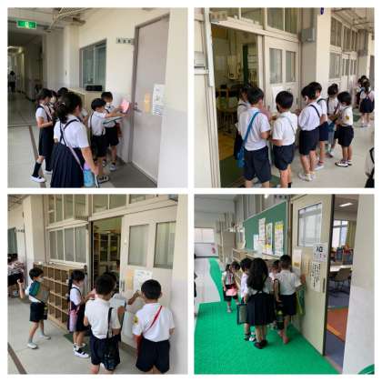 学校内の特別教室などをたんけんし、教室の扉に貼ってある紹介ポスターを読んでいました。