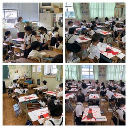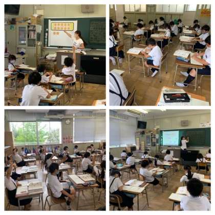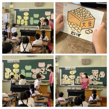 2年生の栄養指導では、「食べ物を3色にわけよう」について全員が食べ物を黒板に貼りながら確かめています。