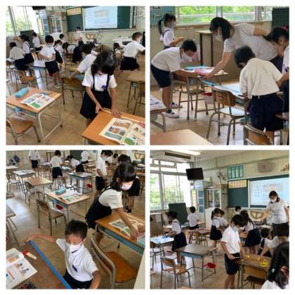 1年生のさんすうでは、紙テープを使って長さ比べをしています。
