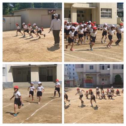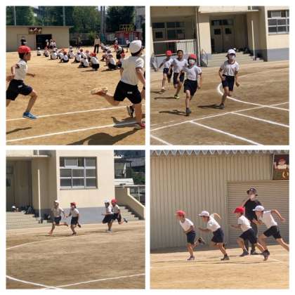 4年生・2年生が運動会の待機場所や短距離走のスタート・ゴールなどの確認をしています。