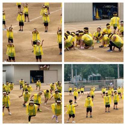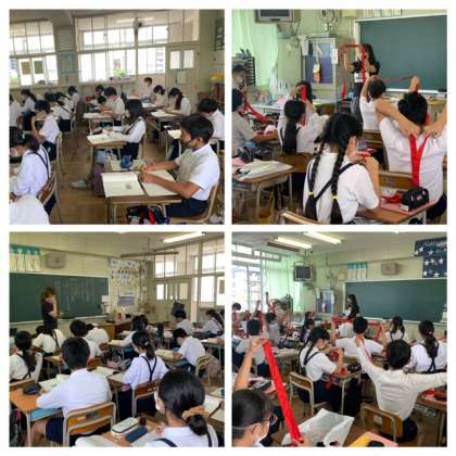 6年生の国語では、文と文とのつながりについて、間に入る言葉を考える学習をしています。また、運動会で使うハチマキのつけ方を練習しています。