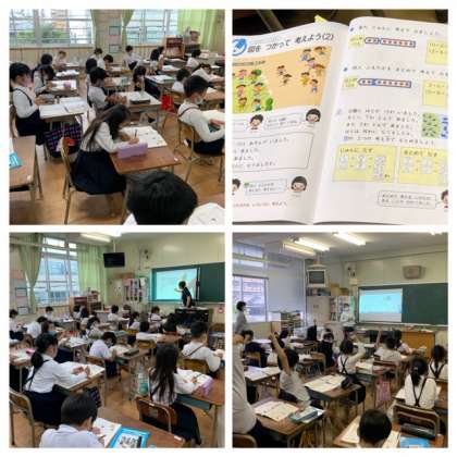 2年生が新出漢字の学習したり、算数では、まとめて考えるしかたで計算したりしています。
