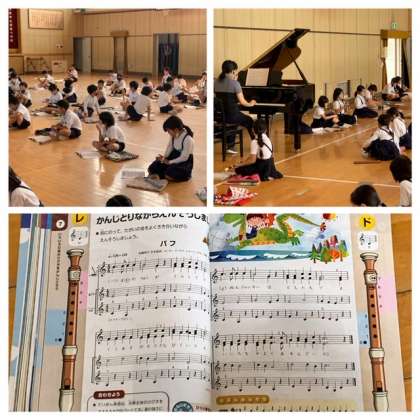 3年生の音楽では、広い講堂でリコーダーの演奏や歌を歌っています。