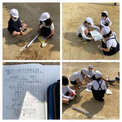 理科では、日なたと日かげの地面の温度を比べています。