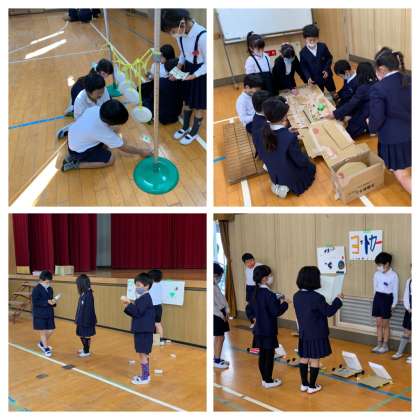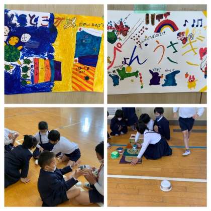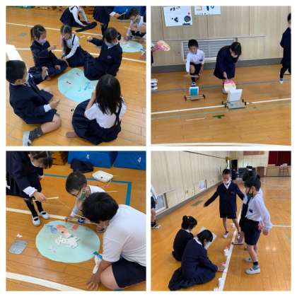 ぴょんうさぎ・とことこガメ・ロケットポン・パッチンガエル・ころころころん・ヨットカーなど、2年生が用意したおもちゃを1年生が楽しんでいました。