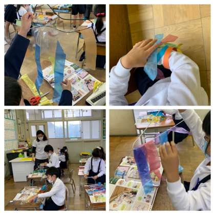 図画工作では、揺れると楽しい飾りを考えて作っています。