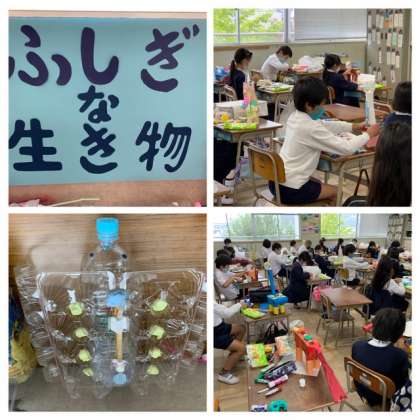 3年生がペットボトルなどを使って、ふしぎな生き物を製作しています。
